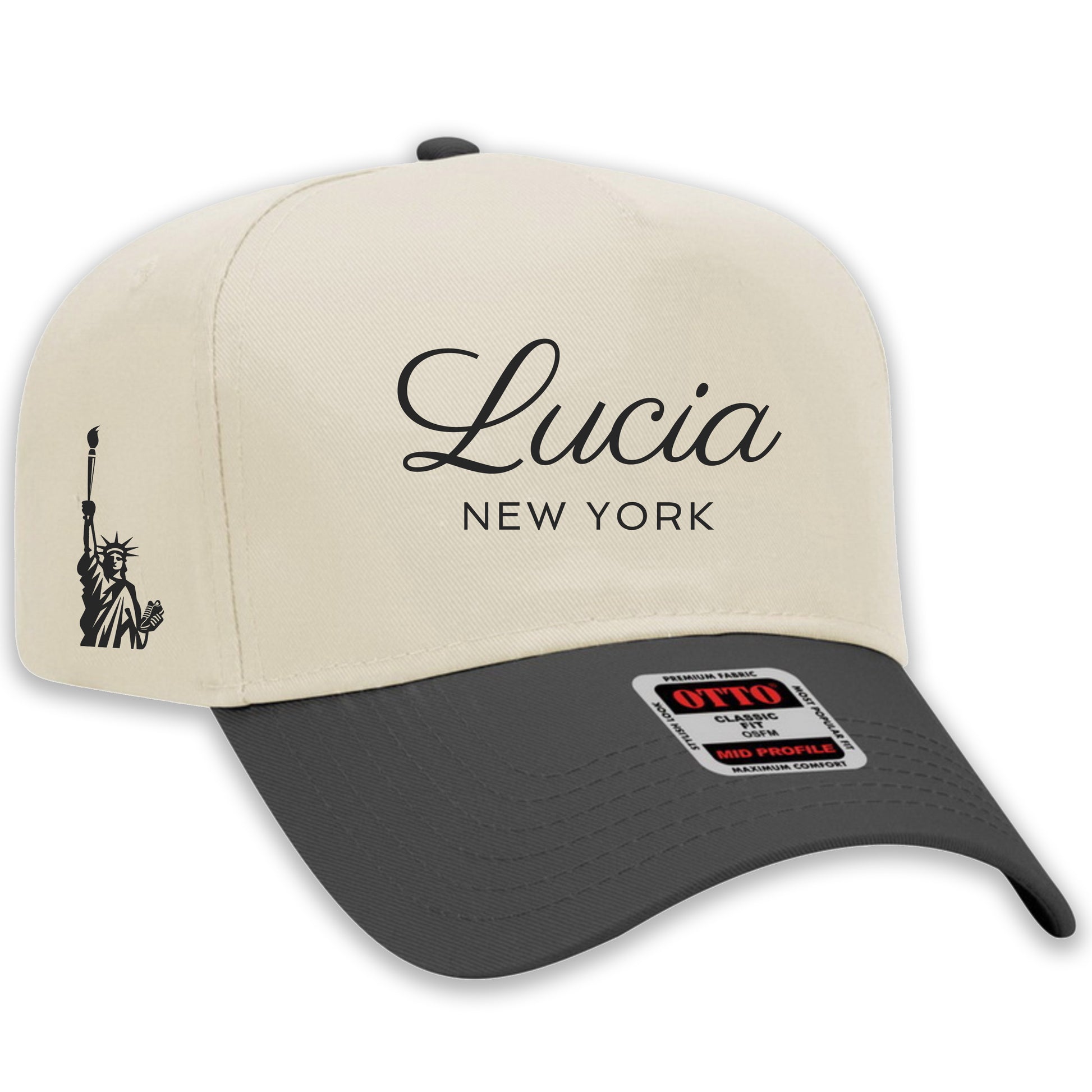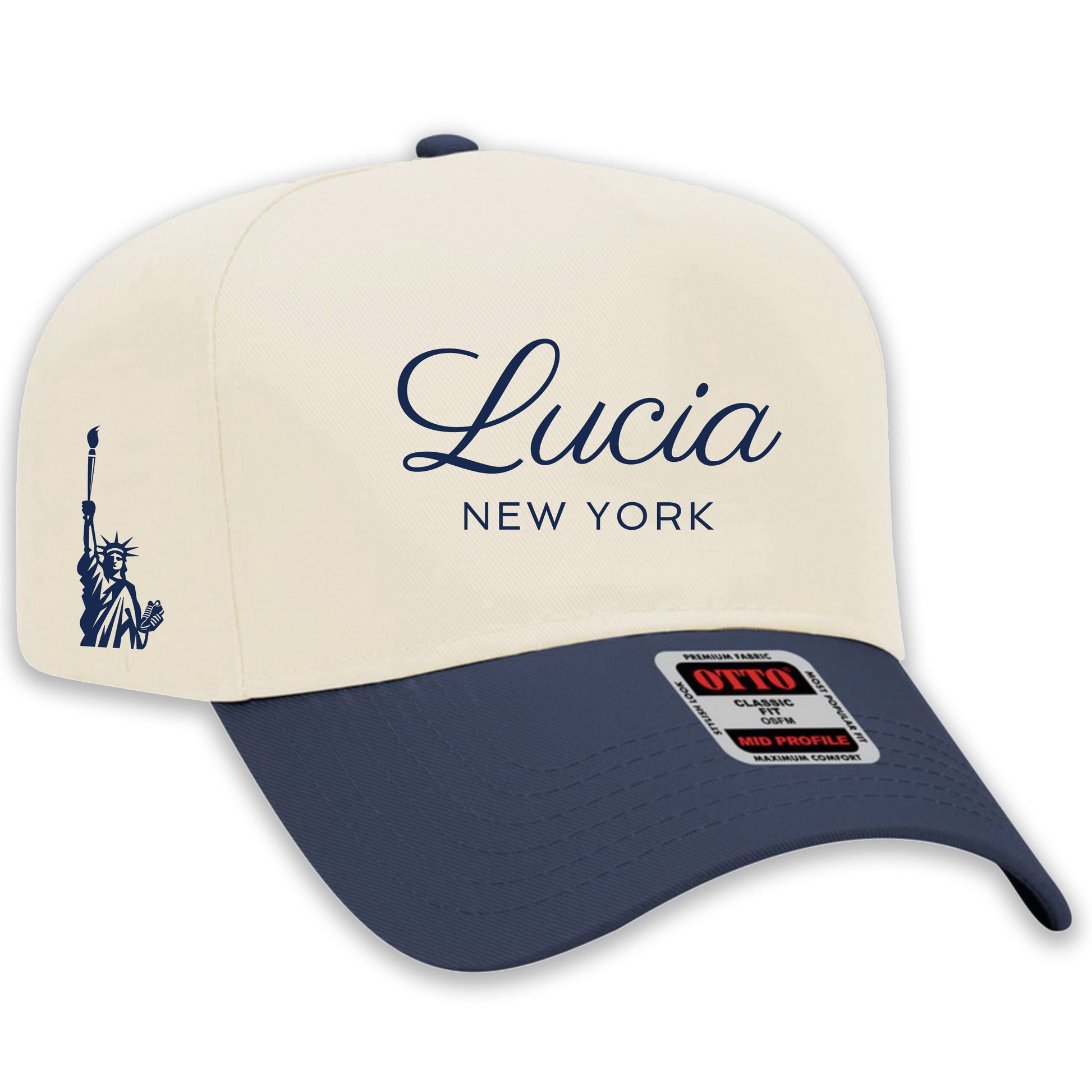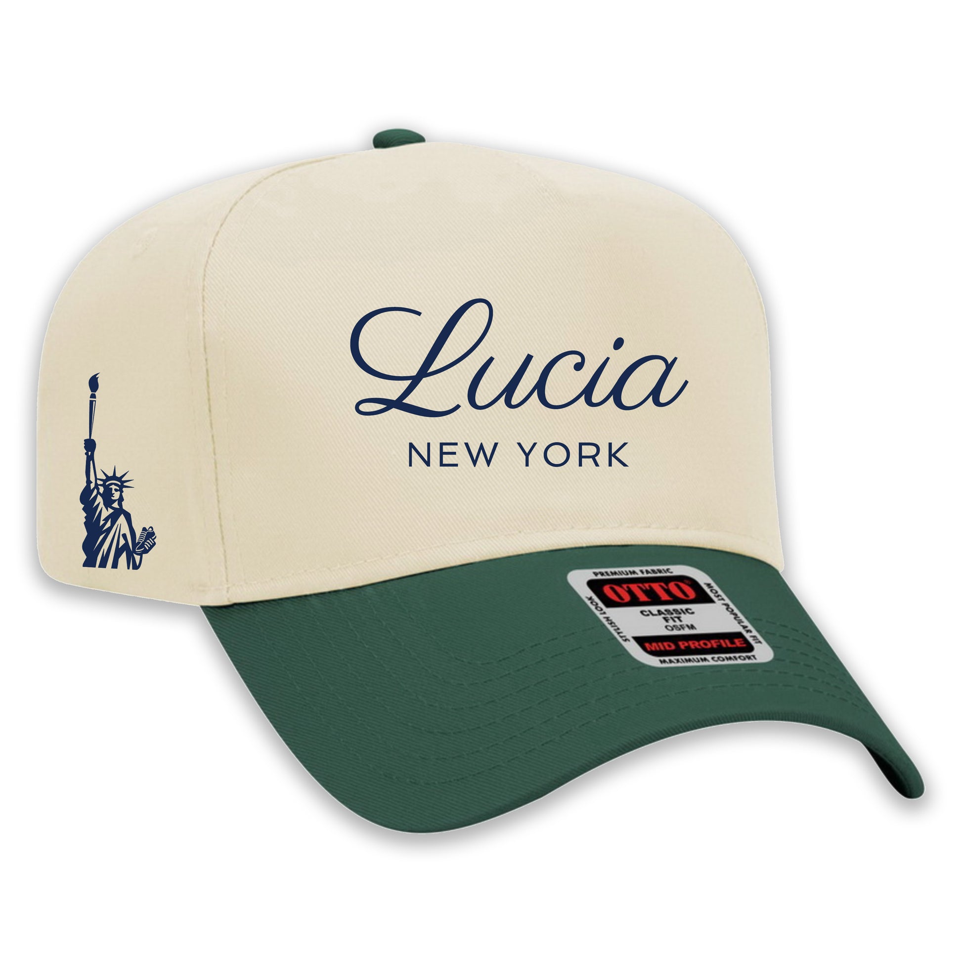 Illustration of the iconic Statue of Liberty holding a sneaker and paint brush on right side of hat.